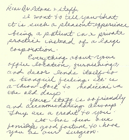 When you visit Dr. Patane's office, you will find a very different environment than most other offices. We guarantee to make your experience here as stress free as possible. As a solo practitioner, Dr. Patane has the benefit of being able to spend more time with each patient addressing their personal and healthcare needs. Dr. Patane's goal is to provide honest, compassionate, expert surgical evaluation and care in a comfortable, caring and relaxed environment.